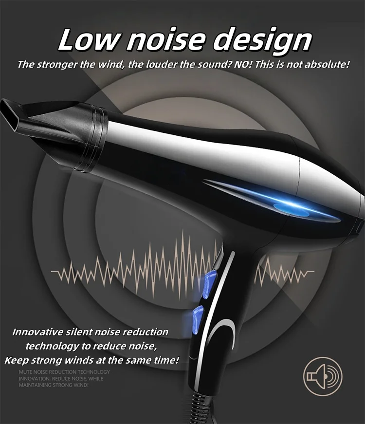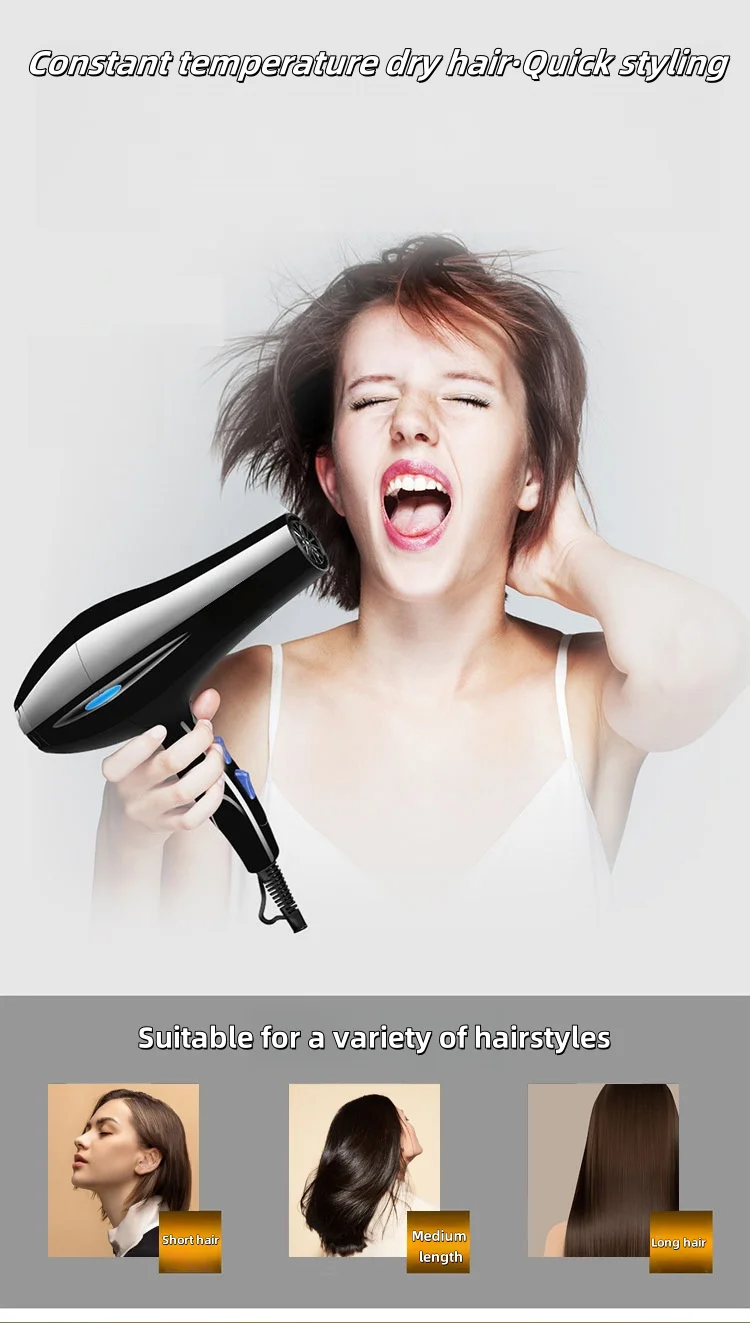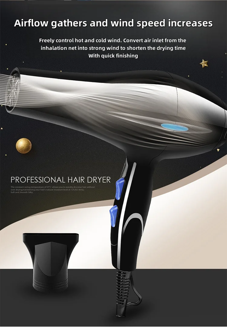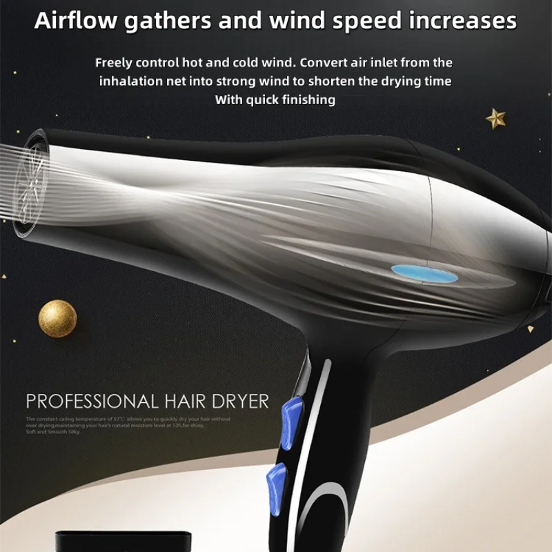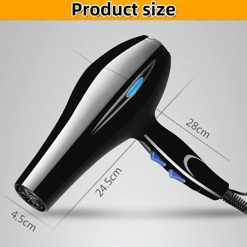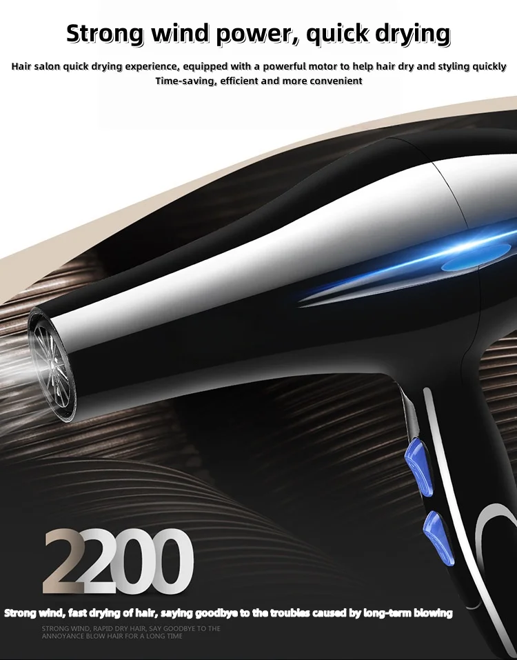 Experience powerful, professional-level styling with our 2200W high-performance hair dryer — the ideal tool for fast, salon-quality drying at home or in professional salons. Featuring quick hot and cold air settings combined with advanced ion technology, this professional hair dryer helps reduce frizz, enhance shine, and deliver silky-smooth results with each use. Designed for maximum airflow and efficiency, it ensures rapid drying while maintaining the health of your hair.