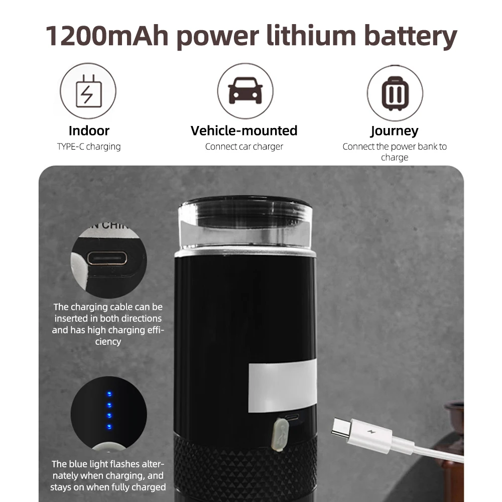 【Large Capacity Battery for Long Standby】 Our automatic coffee machine built-in 1200mAh rechargeable battery. Convenient type-c charging port, takes 3 hours for fully charging and used for about 50 times.
