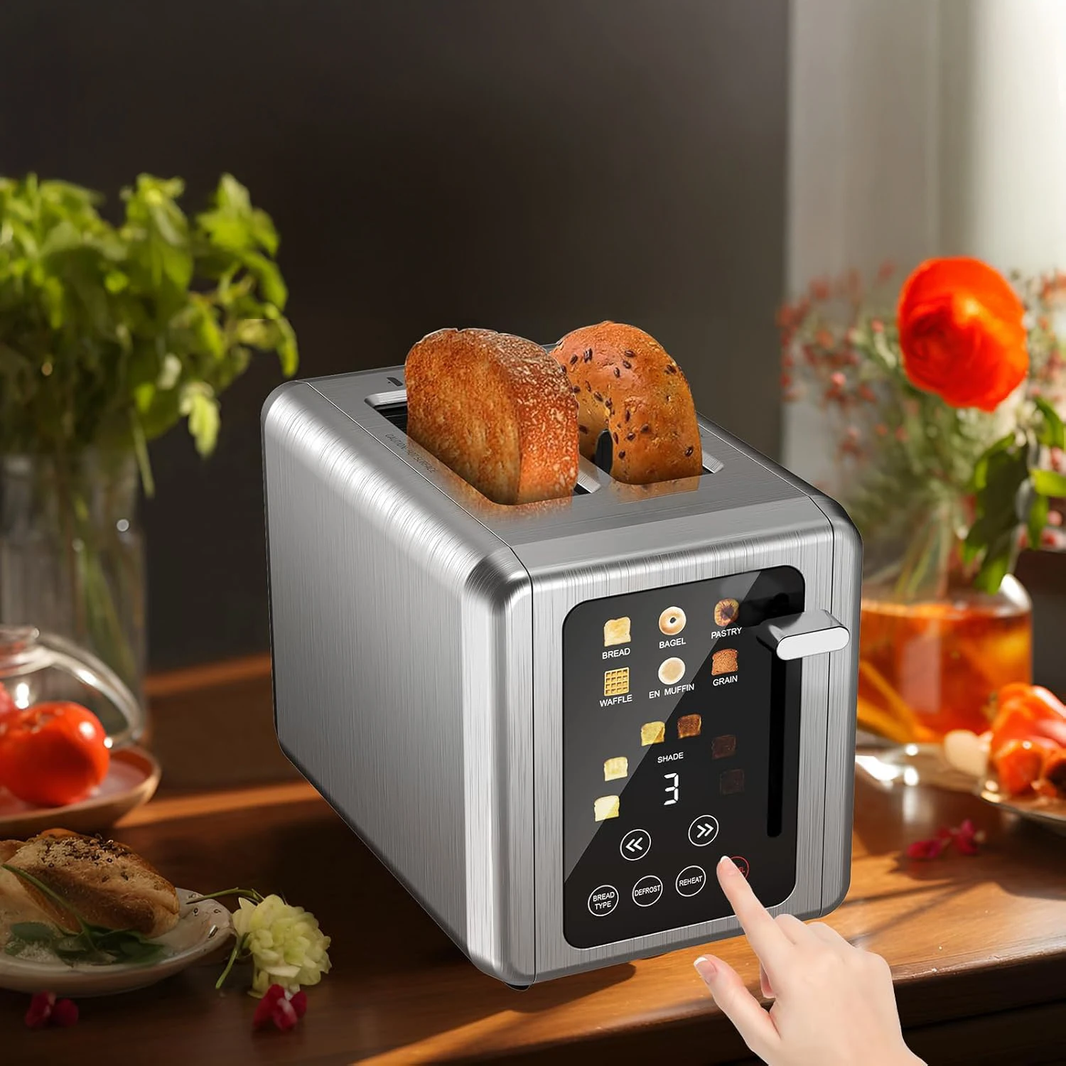 Stainless Steel Toaster, Touch Screen, 2-Slice Automatic Home Bread Toaster, 6 Browning Levels for Breakfast Machine